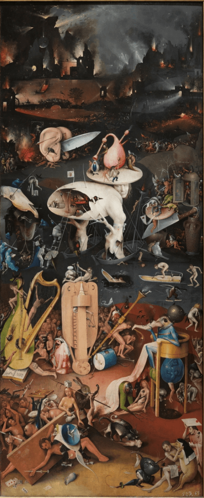 De esa forma termina el tríptico, con un mensaje poderoso de lo que les espera a los que dan rienda suelta a sus pasiones y con un Enrique II que sale con su reputación intacta, por que hay unos que dicen que la finalidad del tríptico es mostrar el Jardín de las Delicias sin el compromiso de ser juzgado o señalado de pervertido, ya que las imágenes de el Jardín del Eden y El Infierno dan un carácter celestial y punitivo respectivamente, para salir impune de haber revelado la obra Central, el esplendido Jardín de las Delicias.